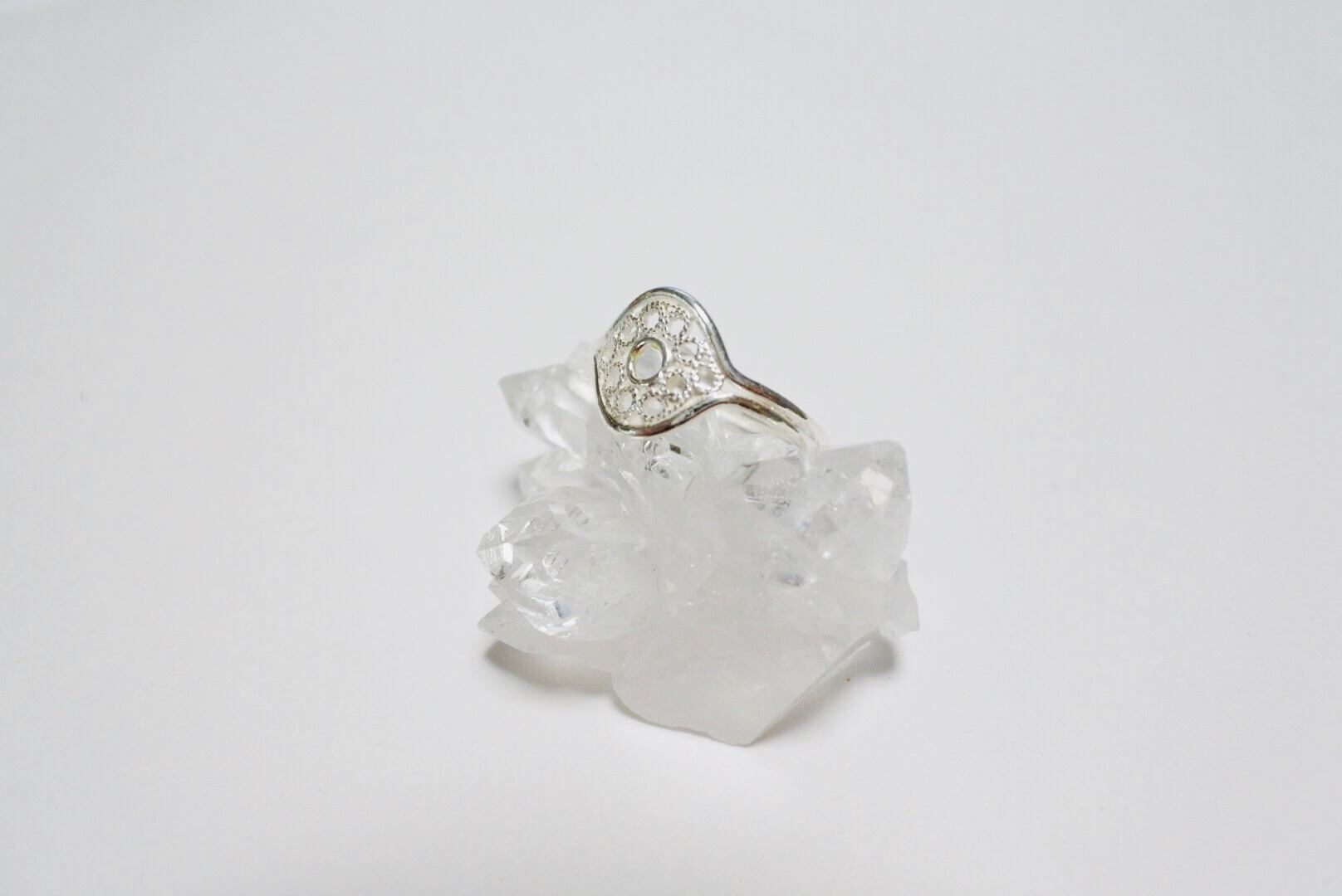 髪の毛ほどの細さの銀線を撚り合わせ、様々な形にしたものをシルバーのフレームに嵌め込んで作ります。