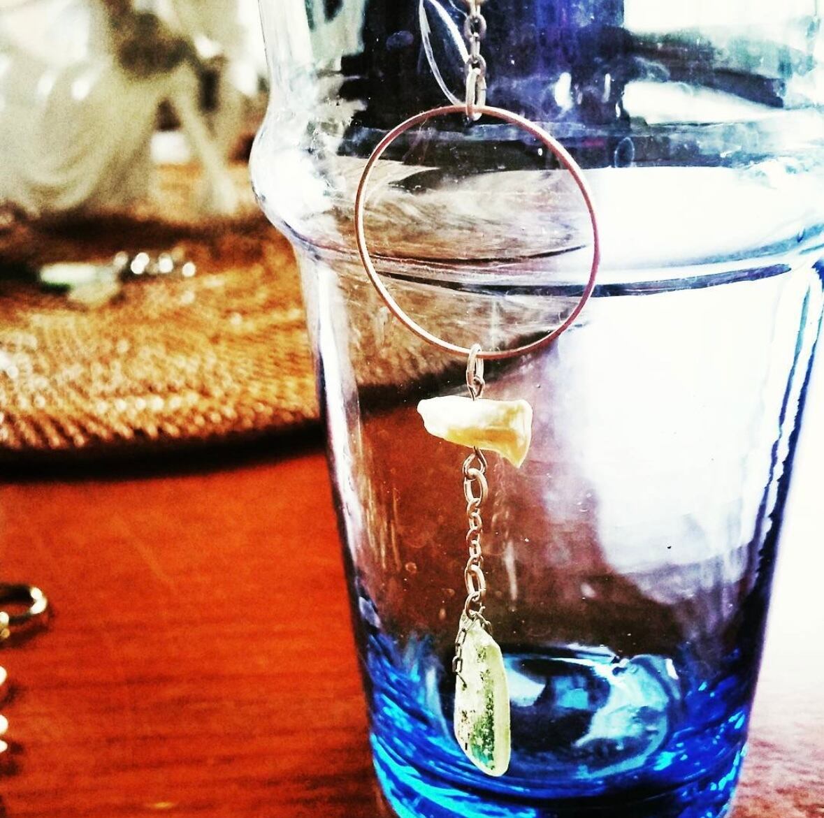 ローマングラス×淡水パールのアシンメトリーピアスです。