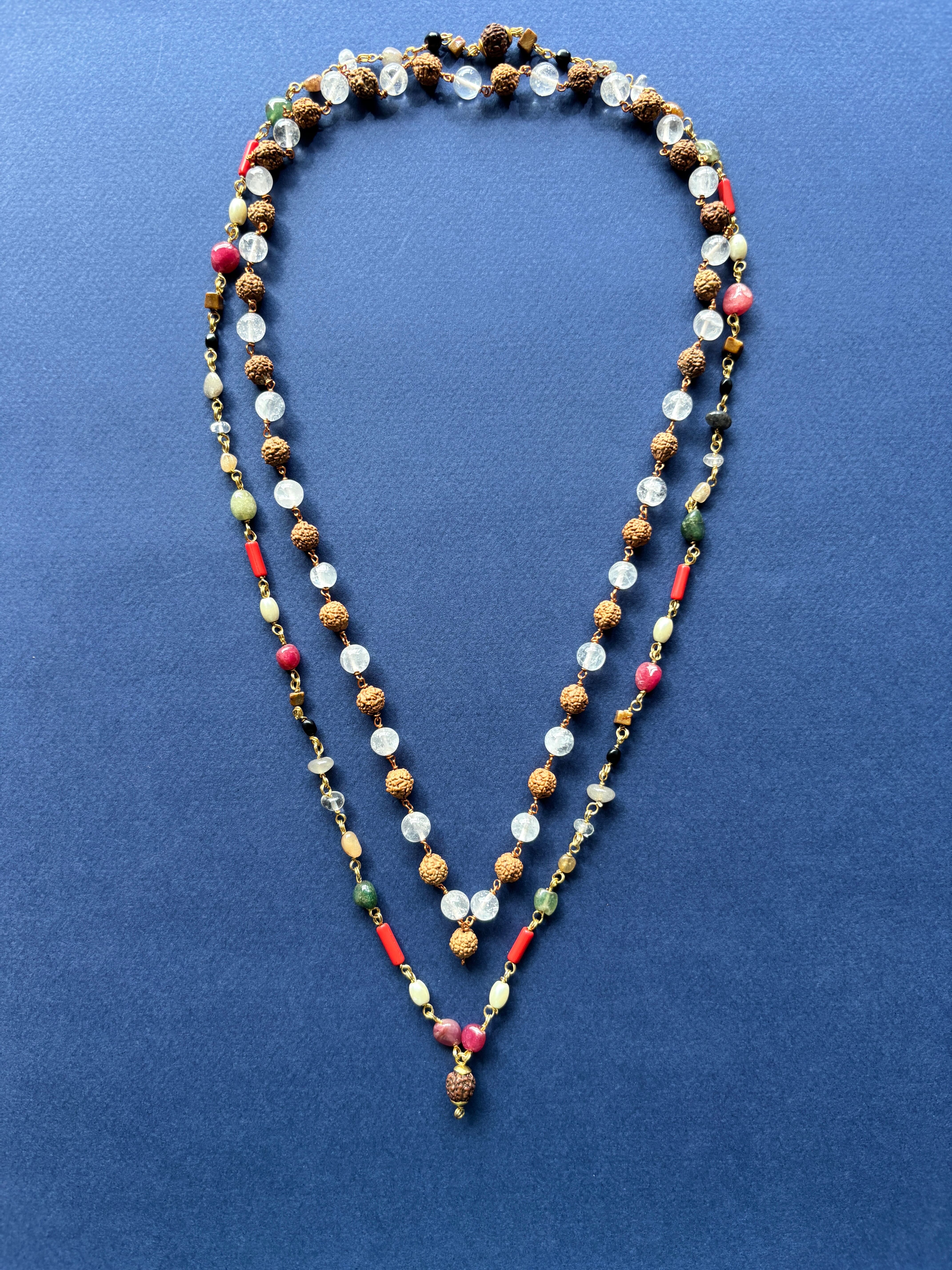 宇宙を象徴する九つの石とシヴァ神の象徴でもある菩提樹の実をあしらったネックレス。