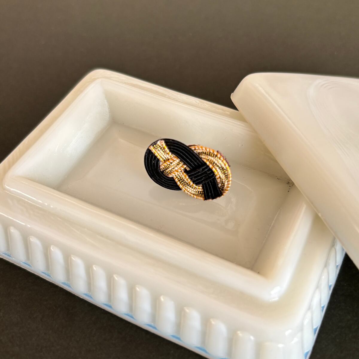 繊細な結びの中に、輝く渋みのあるゴールドとブラックのコントラストで遊ぶ大人の雰囲気を纏ったデザインです。